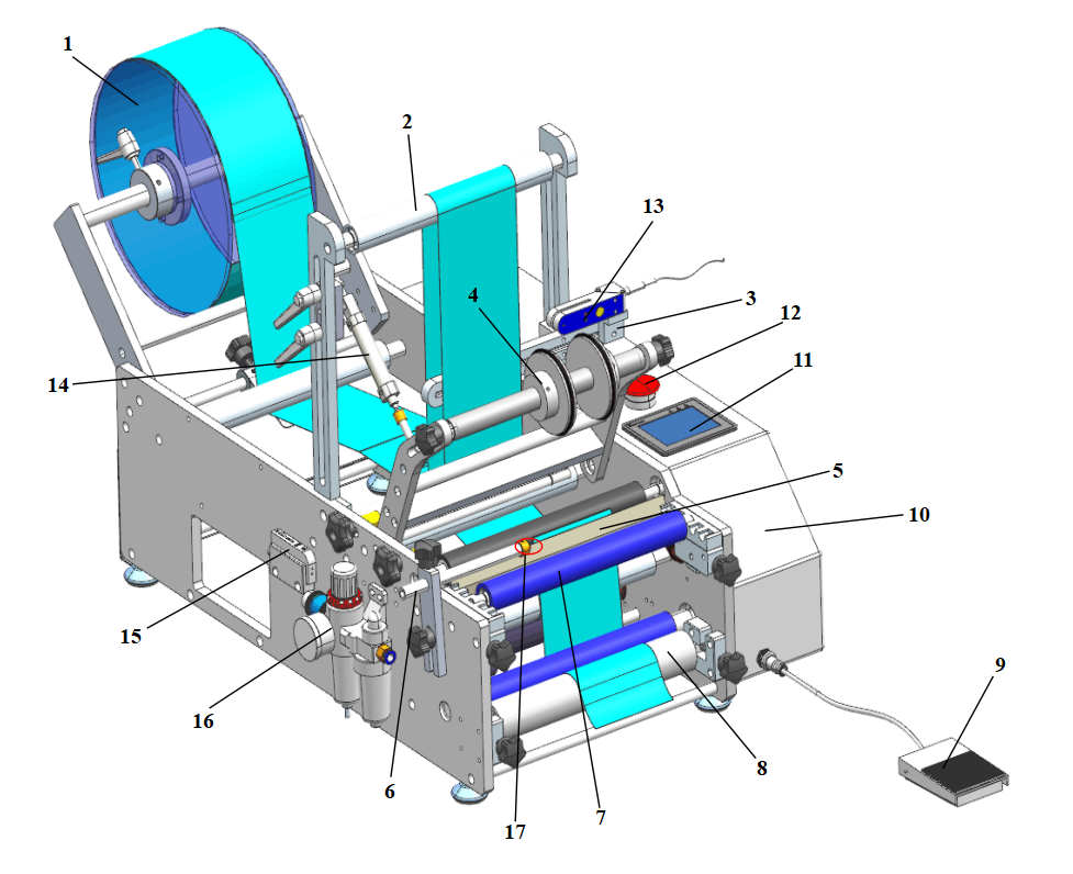 4、壓頂機(jī)構(gòu):用于壓置工件,保證覆標(biāo)效果,可通過貼標(biāo)機(jī)左側(cè)的旋鈕調(diào)節(jié)松緊度;