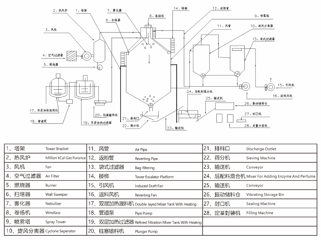 | 干燥塔(干燥塔體、塔承載加強圈、骨架、熱風(fēng)分布器、人孔檢修門、出風(fēng)管及清洗人孔、錐體氣錘、主塔支撐鋼架、進塔熱風(fēng)管道、變徑連接管道、保溫材料、伴熱攪拌罐、電加熱、過濾器)、熱源系統(tǒng)(燃氣熱風(fēng)爐)、鼓風(fēng)機(鼓風(fēng)機、初/中效空氣過濾器)、進料泵、噴槍、高效旋風(fēng)分離器(高效旋風(fēng)分離器、旋風(fēng)出料閥、緩存料倉)、除塵系統(tǒng)(管道、布袋除塵器)、引風(fēng)機、控制系統(tǒng)(控制柜、變頻器、溫度傳感器、壓力傳感器)、輔助系統(tǒng)(欄桿、扶梯、現(xiàn)場電線電纜橋架、現(xiàn)場鋼架結(jié)構(gòu)平臺) |