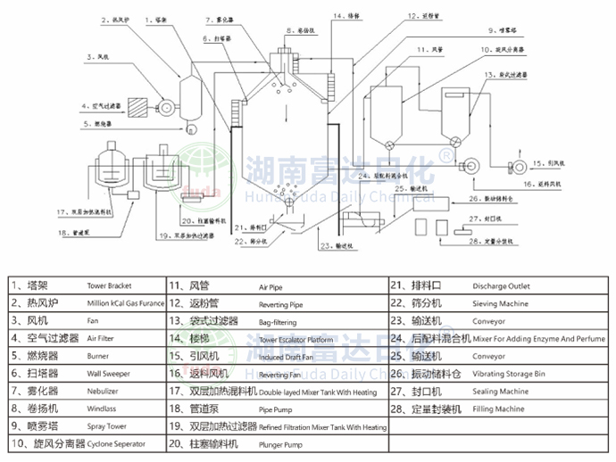 | 干燥塔(干燥塔體、塔承載加強圈、骨架、熱風(fēng)分布器、人孔檢修門、出風(fēng)管及清洗人孔、錐體氣錘、主塔支撐鋼架、進(jìn)塔熱風(fēng)管道、變徑連接管道、保溫材料)、熱源系統(tǒng)(燃?xì)鉄犸L(fēng)爐)、鼓風(fēng)機(鼓風(fēng)機、初/中效空氣過濾器)、進(jìn)料泵、噴槍、高效旋風(fēng)分離器(高效旋風(fēng)分離器、旋風(fēng)出料閥)、除塵系統(tǒng)(管道、布袋除塵器)、引風(fēng)機、控制系統(tǒng)(控制柜、變頻器、溫度傳感器、壓力傳感器)、輔助系統(tǒng)(欄桿、扶梯、現(xiàn)場電線電纜橋架、現(xiàn)場鋼架結(jié)構(gòu)平臺) |