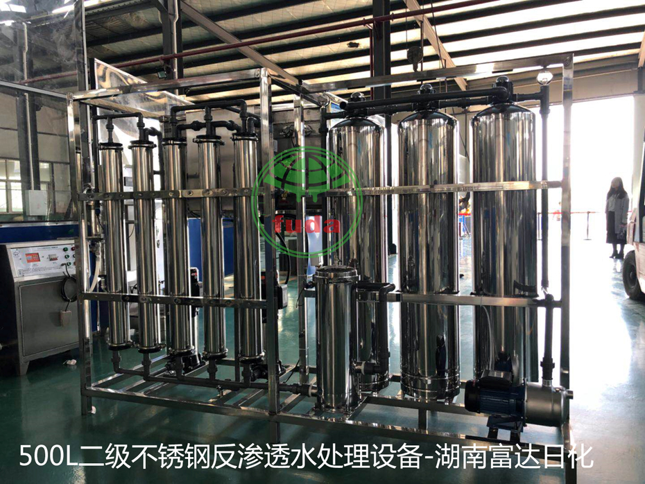 | 主機架、原水泵、石英砂過濾器、活性炭過濾器、高壓泵、普通反滲透膜、低壓保護器、普通二級反滲透膜、樹脂過濾器、5級保安過濾器。 | 適合高檔洗滌劑、消毒劑、洗發水等化妝品、國六尿素溶液等汽車用品 | 500L/H | 金屬離子和細菌去除率99%左右 |